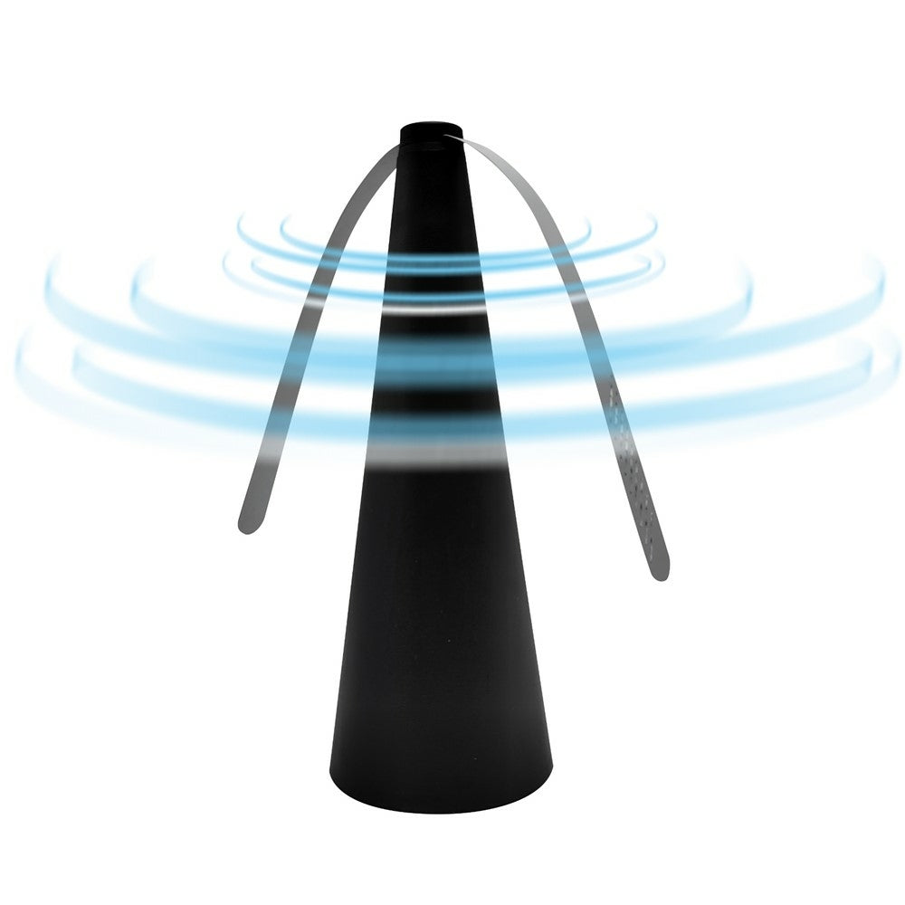 Le mouvement des pales combiné aux bandes réfléchissantes situées à l'extrémité des pales fera fuir les insectes volants.