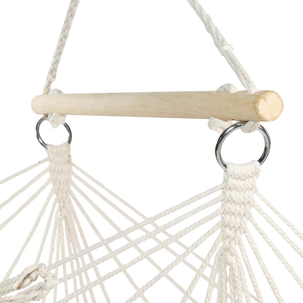 Détails matière : corde tressée, barre en bois et anneaux en métal.